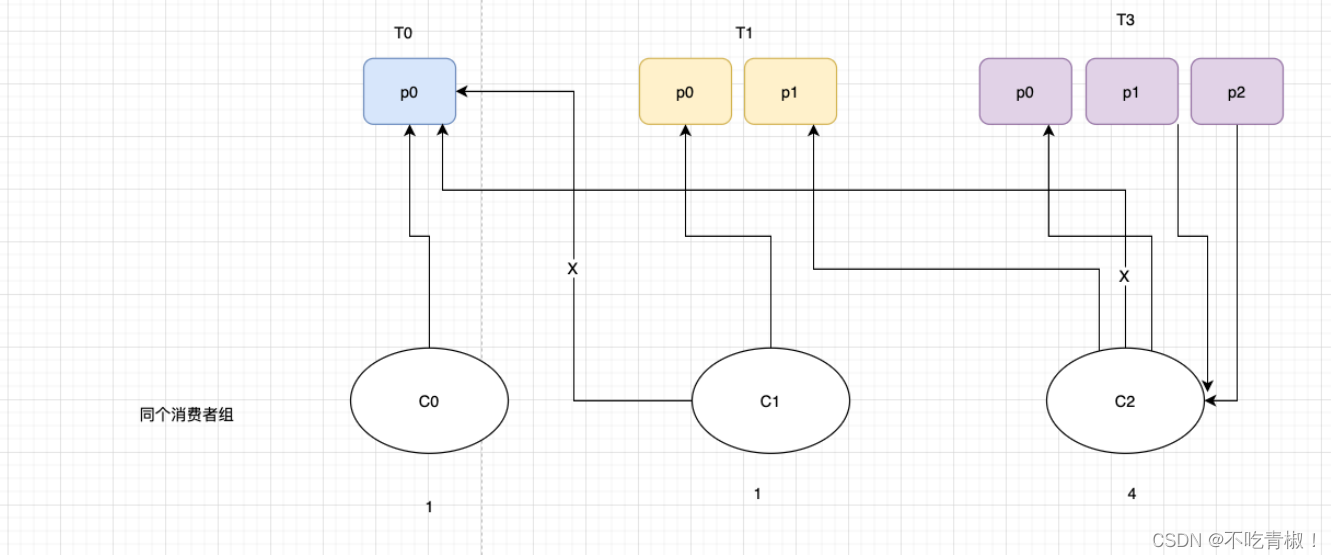 - 有3个消费者C0、C1和C2,他们共订阅了 3 个主题:t0、t1 和 t2