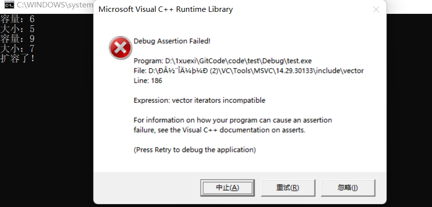 这是为什么呢?不难发现,vector是序列式容器,在内存中是一块连续的内存,当内存不足需要扩容时,需要将原来的空间释放掉,重新开辟一片连续的空间,所以这样操作原来的迭代器相当于非法操作内存,如果容器没有扩容的话,只有it=v.end()的迭代器失效,那怎么解决呢?只需要在每次在操作迭代器前重新给迭代器赋值。