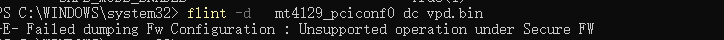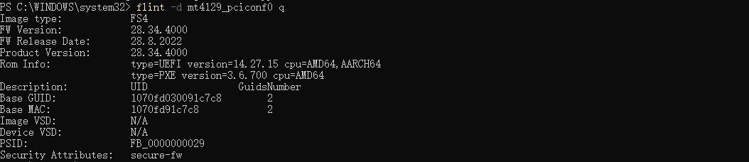 查询网卡固件信息(FW 版本、PSID、ROM 信息),下图示例是一个OEM卡的固件信息出现了Security Attributes:secure-fw就代表改卡开启了固件保护无法直接通过命令对固件进行读写。