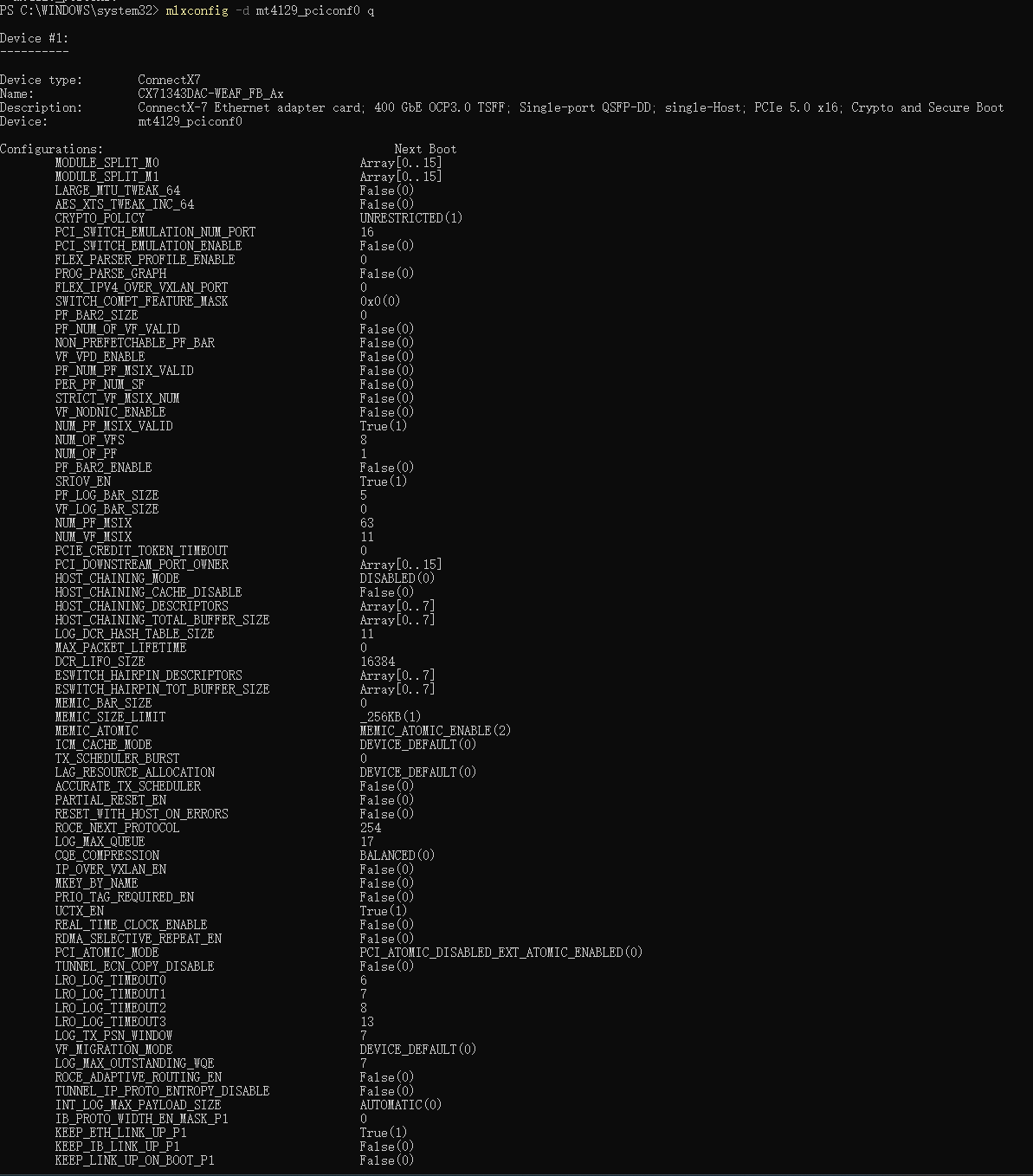 运行此命令将查询网卡配置参数(包括 SR-IOV、功耗策略、分拆模式等),使用时将<mst_dev>替换成你所需要查询的让卡名称如:mt4129_pciconf0 。