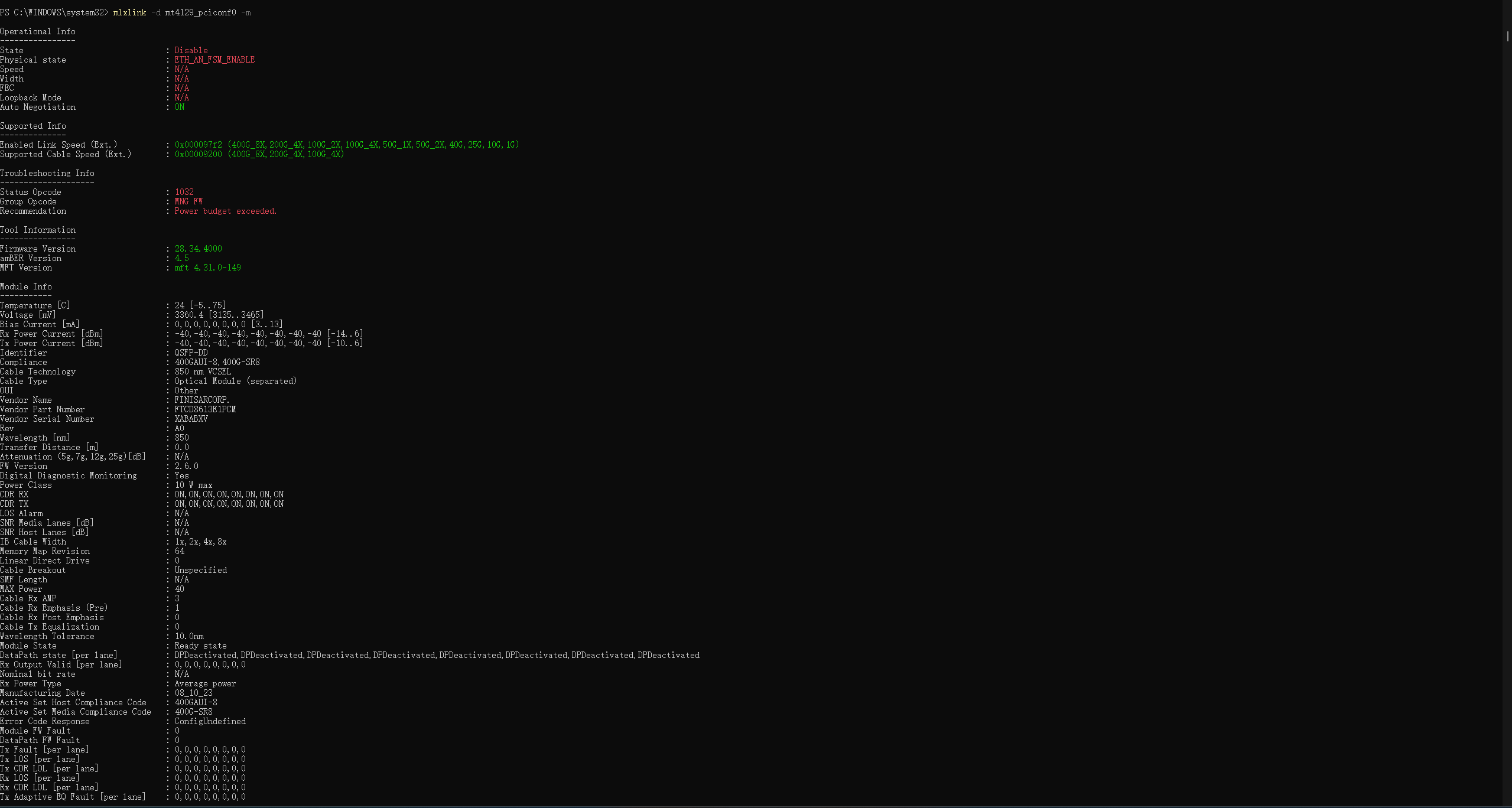 此命令用来读取并显示光模块的详细信息,输出信息如下图,图中就是一个典型的光模块功耗超过网卡限制功耗的例子。光模块功耗分类如下: