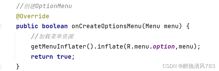 上述方法中使用getMenuInflater().inflater(R.menu.option,menu):将菜单资源加载进来