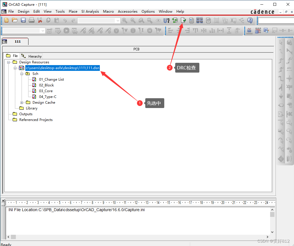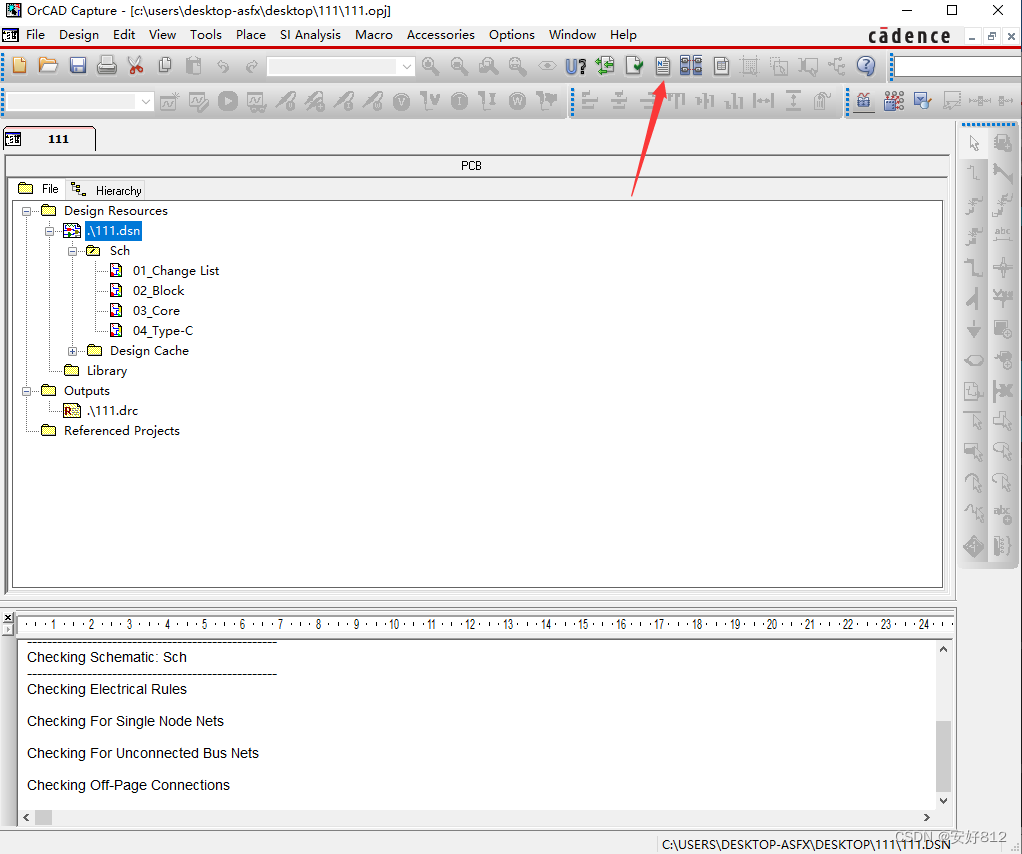 1.1、在OrCAD Capture中对dsn文件进行DRC检查。一定要先点击dsn文件再进行检查。