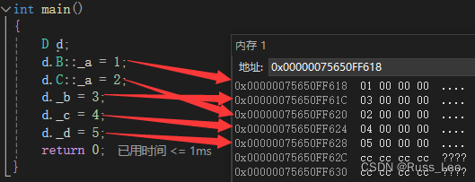 通过内存窗口,我们可以看到D类对象当中各个成员在内存当中的分布情况如下: