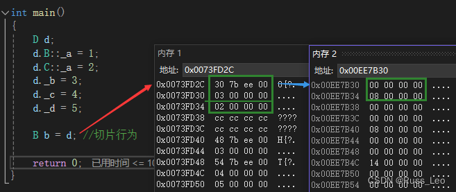 若是将D类对象赋值给B类对象,在这个切片过程中,就需要通过虚基表中的第二个数据找到公共虚基类A的成员,得到切片后该B类对象在内存中仍然保持这种分布情况。