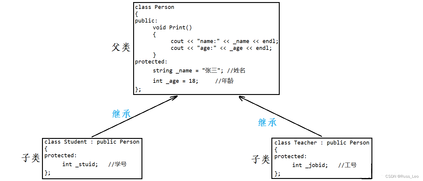 继承后,父类Person的成员,包括成员函数和成员变量,都会变成子类的一部分,也就是说,子类Student和Teacher复用了父类Person的成员。
