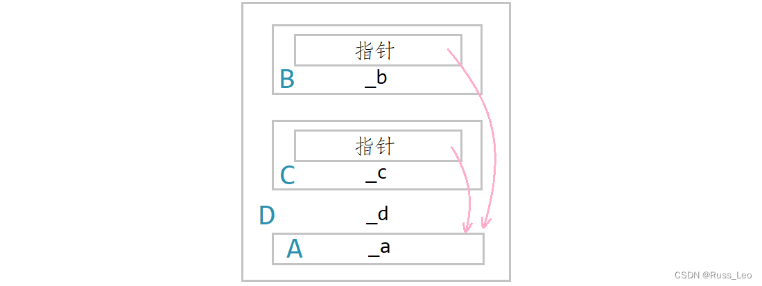 其中D类对象当中的_a成员被放到了最后,而在原来存放两个_a成员的位置变成了两个指针,这两个指针叫虚基表指针,它们分别指向一个虚基表。