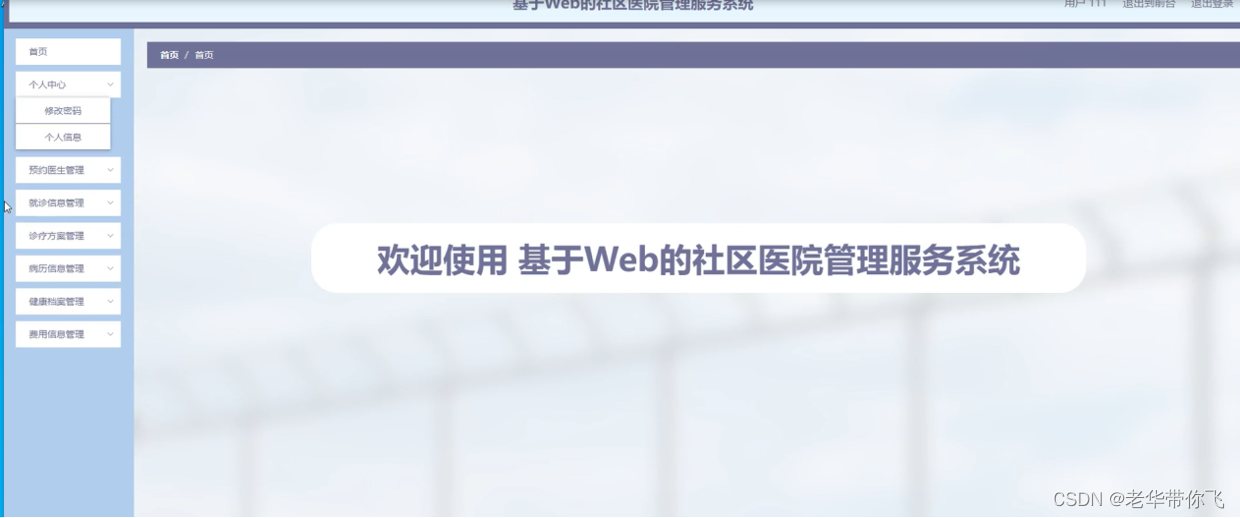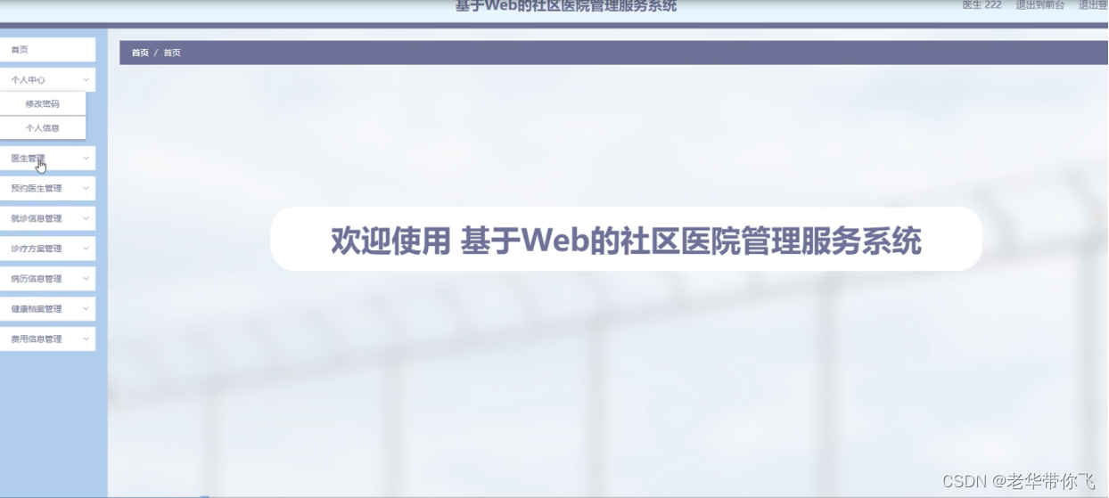 医生登录进入社区医院管理服务系统,可以对首页、个人中心、医生管理、预约医生管理、就诊信息管理、诊疗方案管理、病历信息管理、健康档案管理、费用信息管理等功能进行相应操作,如图5-19所示。