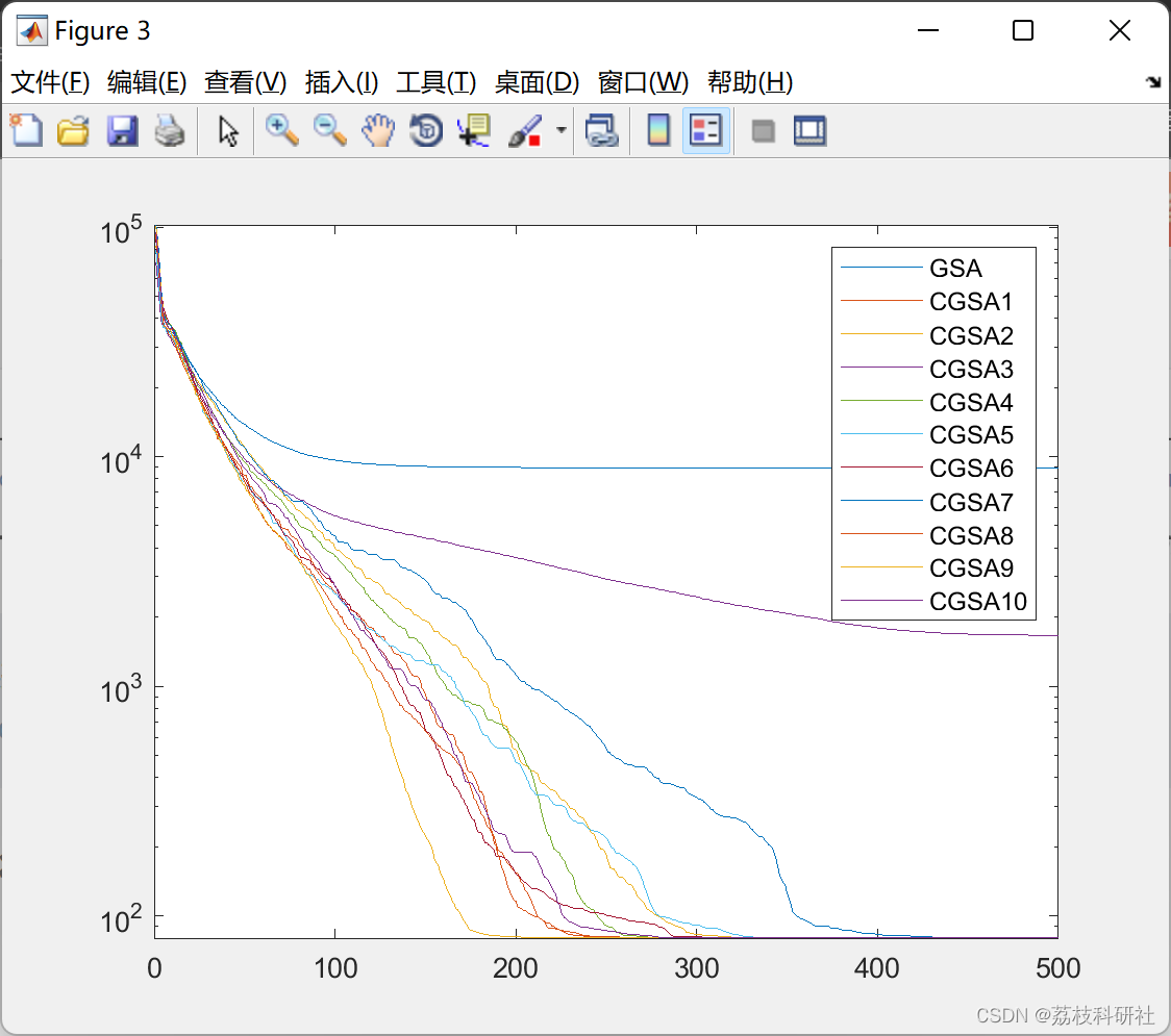 legend('GSA', 'CGSA1', 'CGSA2', 'CGSA3', 'CGSA4', 'CGSA5', 'CGSA6', 'CGSA7', 'CGSA8', 'CGSA9', 'CGSA10')