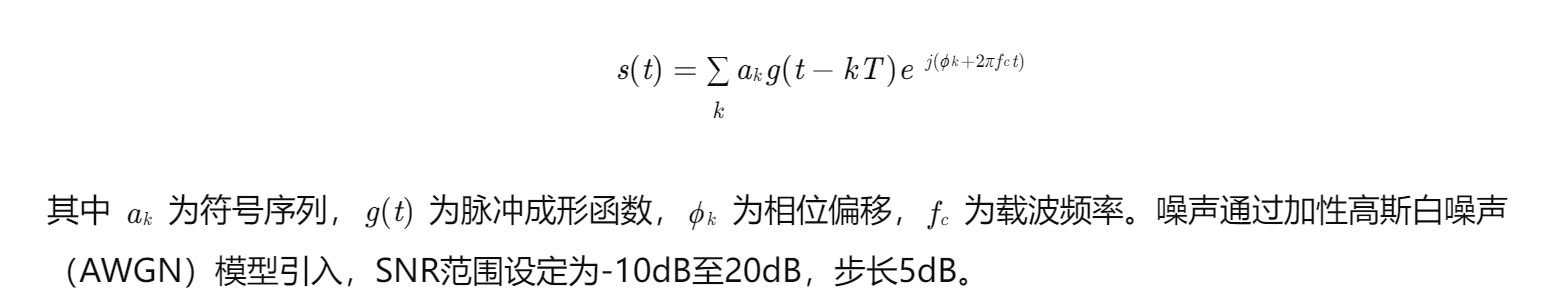 实验采用6种常见调制方式:BPSK、QPSK、8-PSK、16-QAM、64-QAM和BFSK。信号通过复基带模型生成: