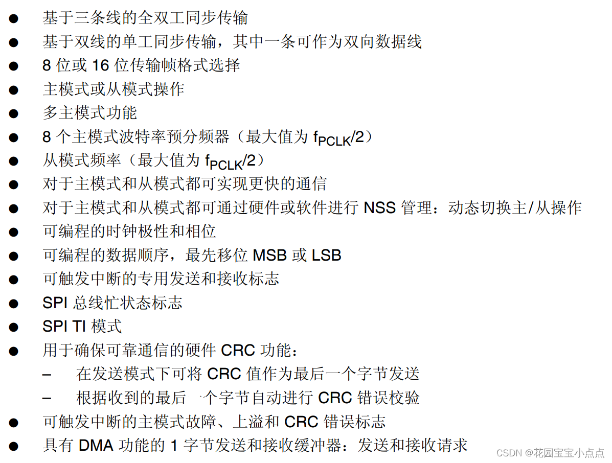 - 外设的写操作和读操作是同步完成的。如果只进行写操作,主机只需忽略接收到的字节:反之,若主机要读取从机的一个字节,就必须发送一个空字节来引发从机的传输。