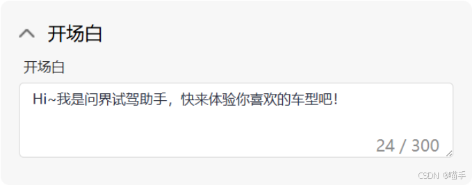 4. 点击开场白可设置在用户与应用开始对话前展示的一段欢迎语,用于营造对话氛围或引导用户提问。 例如:“你好,我是一个对话助手,请输入内容开始对话。”