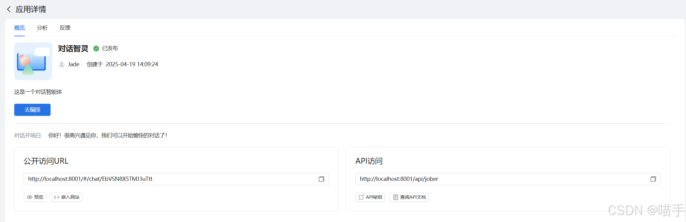 - 发布后,系统会自动生成公开访问和北向接口链接,并可将其分享到外部平台,或嵌入其他业务系统中,可在首页的应用开发页面点击应用卡片,在应用概览中查询