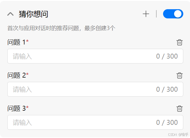 6. 点击猜你想问可预置最多 3 条推荐问题,展示在用户首次打开应用时。