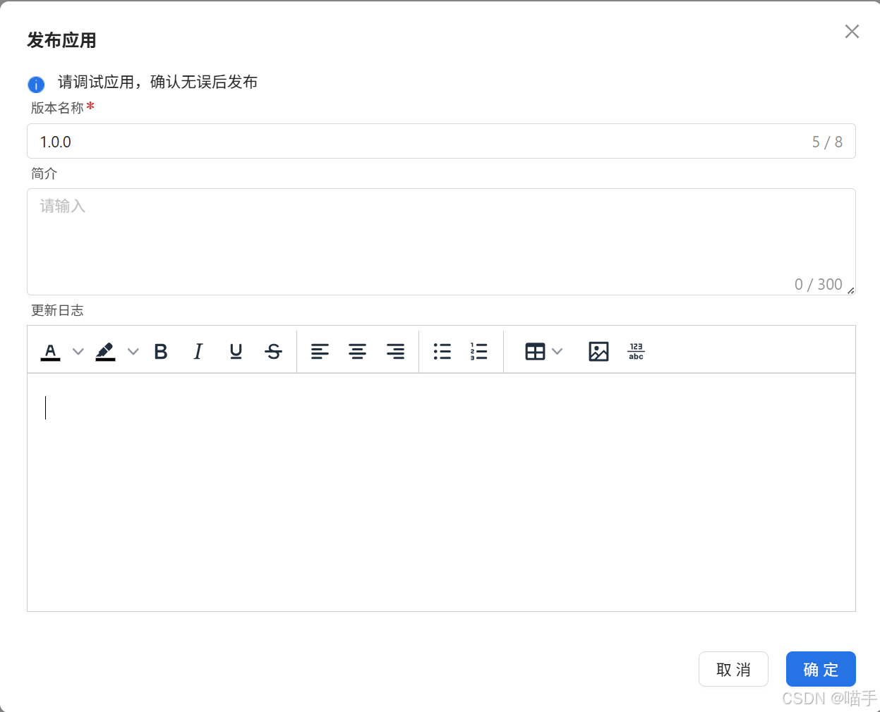 - 测试完成后,点击右上角的发布按钮,填写发布信息。