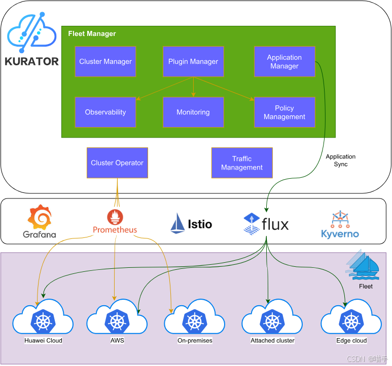 Kurator 则在 Karmada 之上,组织出“Fleet 级别”的管理形态,让多集群调度和应用分发、策略、监控等能力更自然地协同起来。