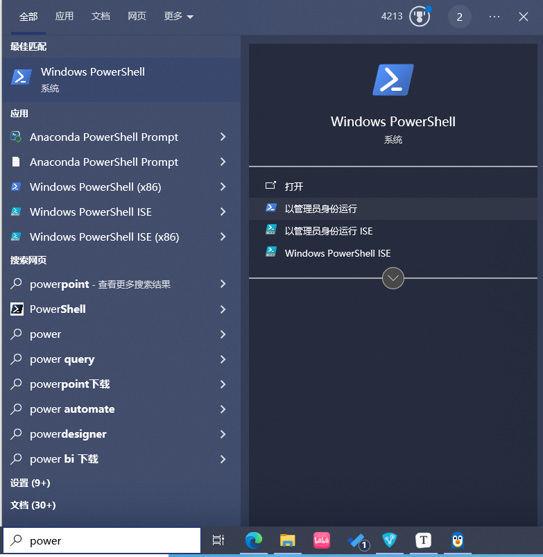用管理员身份打开PowerShell,运行