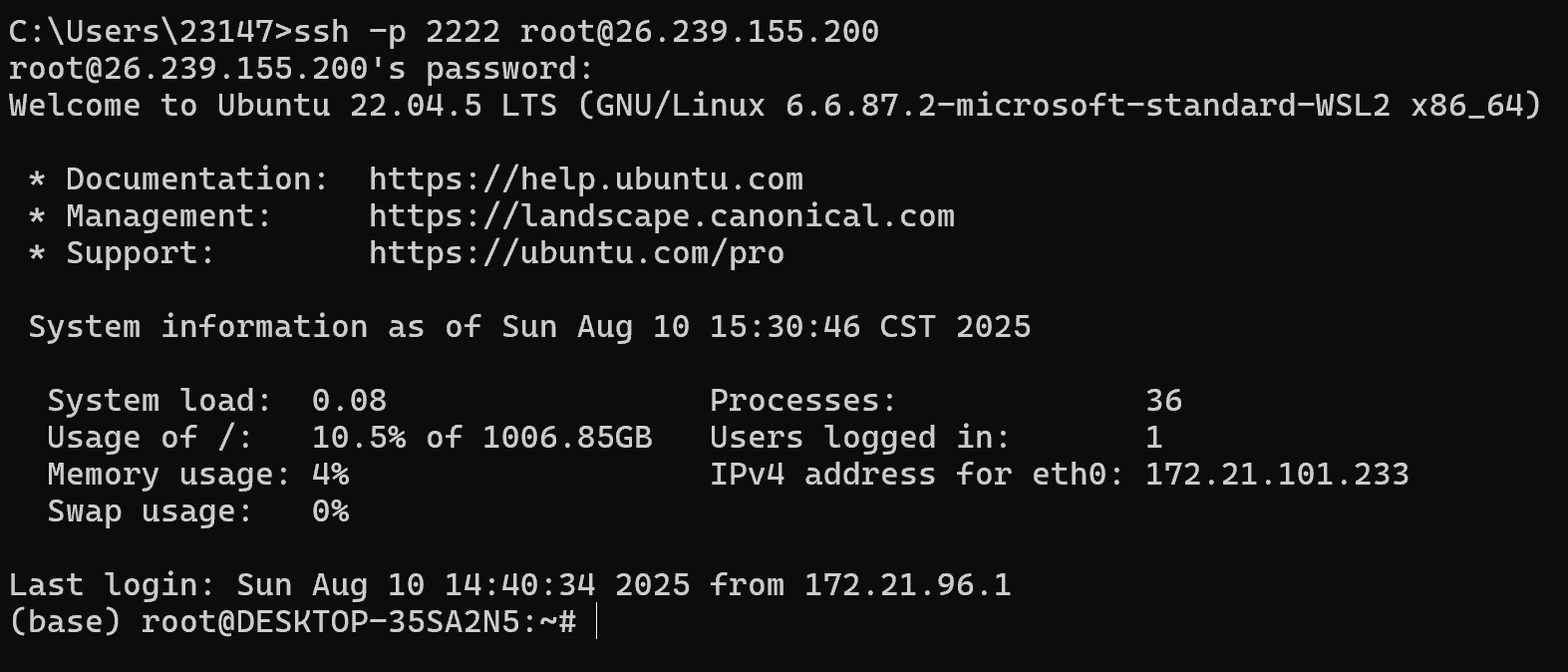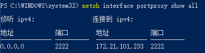 可以看到,端口已经成功转发了。这时,我们的Windows主机就能用ssh连接到wsl。尝试用cmd或者powershell运行一下: