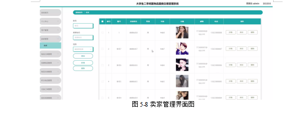 管理员点击卖家管理;在卖家管理页面输入账号、卖家姓名、性别、年龄、头像、邮箱、电话,进行查询或删除卖家信息等操作;如图5-8所示。