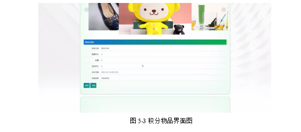 用户点击积分物品;在积分物品页面的搜索栏输入物品名称、物品分类,进行查询,还可以查看物品名称、物品分类、图片、需要积分、数量、签到积分、发布日期等信息,可进行签到、交换等操作,如图5-3所示。