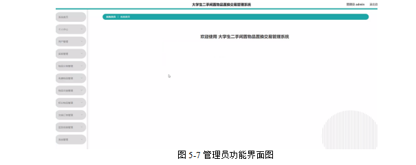 管理员登录进入系统可以查看系统首页、个人中心、用户管理、卖家管理、物品分类管理、免费物品管理、物品交换管理、积分物品管理、交换订单管理、签到信息管理、系统管理等功能进行详细操作,如图5-7所示。