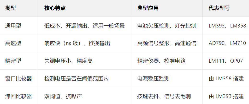用于定时器、振荡器电路(如 555 定时器的核心就是一个比较器,通过设定阈值控制输出高低电平的切换)。