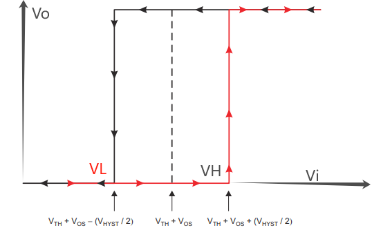 这时候我们慢慢调高Vin,当Vin升到一个叫VH的数值时,比较器的两个输入端电压相等(V+ = V-)。要是再把Vin往高调一点点,就会出现V+比V-大的情况,这时候Vout就会一下子变成高电平。