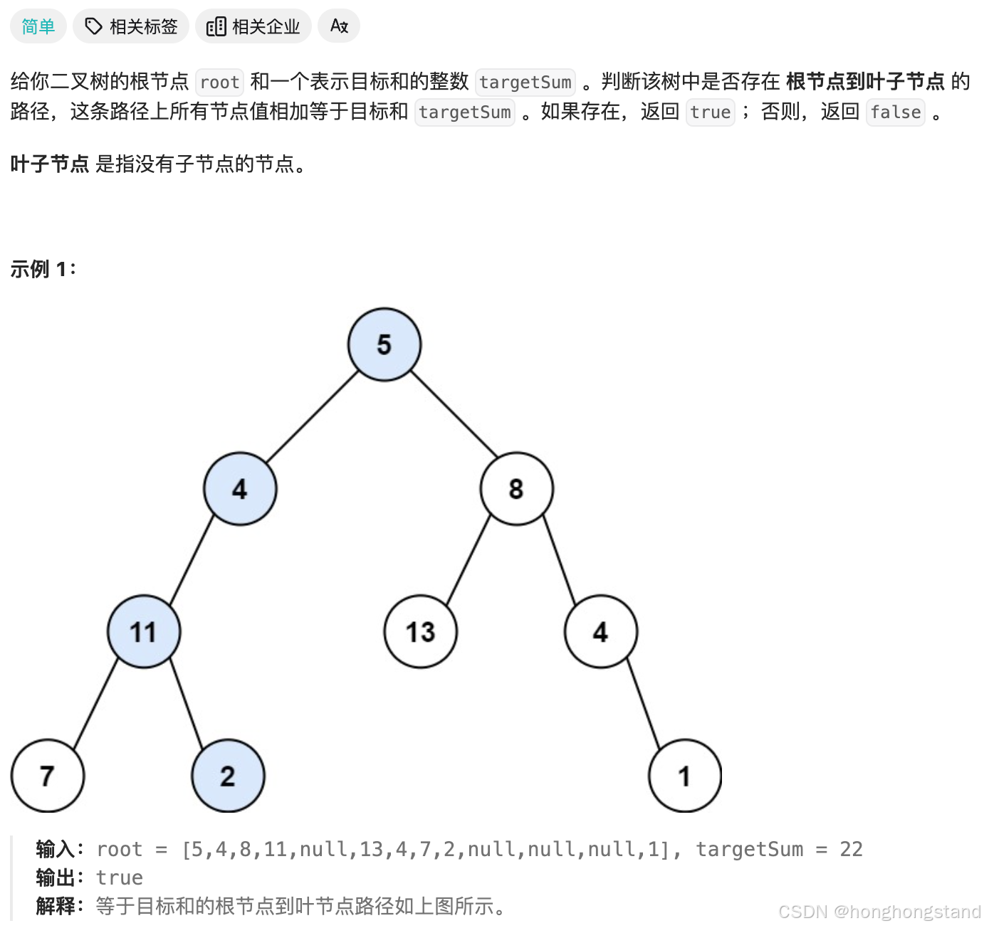 2. 终止条件:当遍历到叶子节点时,停止遍历并比对路径和和目标值