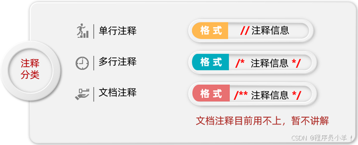 注释:注释是指在程序中添加的说明性信息;注释不参与程序运行,仅起到说明作用。
