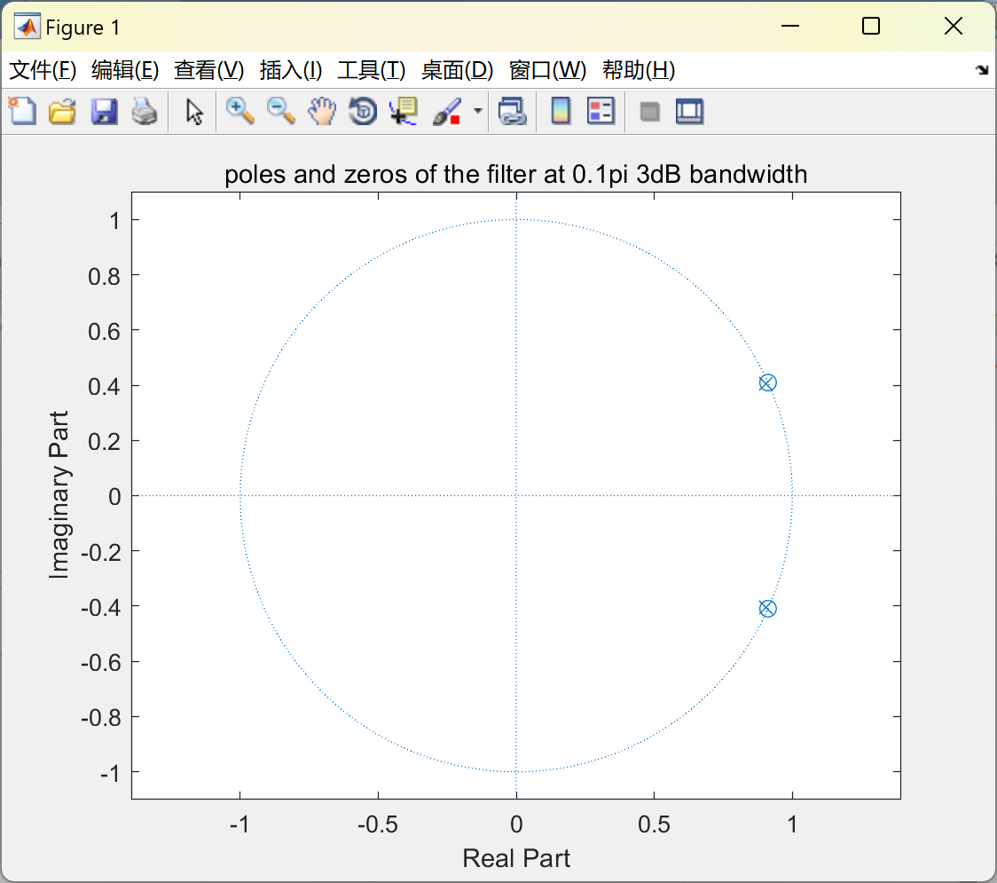 title('poles and zeros of the filter at 0.1pi 3dB bandwidth')
