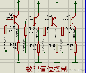 为了有效地提升驱动能力,本系统采用 S8550 三极管对数码管的位进行控制操作。在具体的控制过程中,S8550 三极管的工作状态是由单片机的 P20 至 P23 端口来实施控制的。这样的设计有助于增强对数码管位选的驱动能力,使得数码管能够更加稳定、可靠地显示所需的信息。