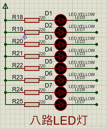 包含八路LED,每一路LED串联一个220欧姆的电阻以限制电流。利用AT89C51单片机的P3端口进行控制。