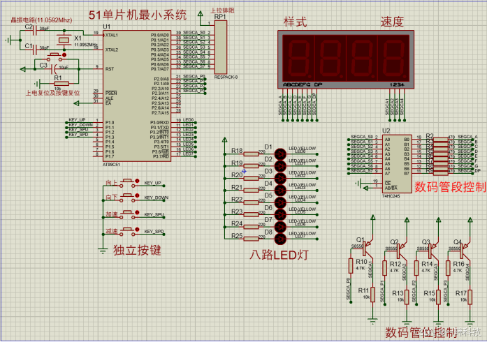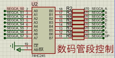 在单片机系统中,为了避免出现灌电流过大的情况,我们采用了 74HC245 芯片来对数码管的段进行控制。具体而言,该 74HC245 芯片的操作是由单片机的 P0 口来负责控制的,以此确保整个数码管的段控制电路能够稳定、安全地运行,避免因灌电流过大而可能引发的电路故障或性能下降等问题。
