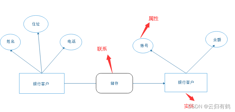 如“银行客户”实体集中的每个实体均具有姓名、住址、电话等属性联系: