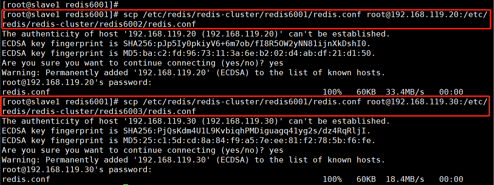 scp /etc/redis/redis-cluster/redis6001/redis.conf root@192.168.119.20:/etc/redis/redis-cluster/redis6002/redis.conf