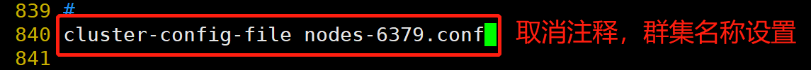 cluster-config-file nodes-6379.conf #840行,取消注释,群集名称文件设置,无需修改