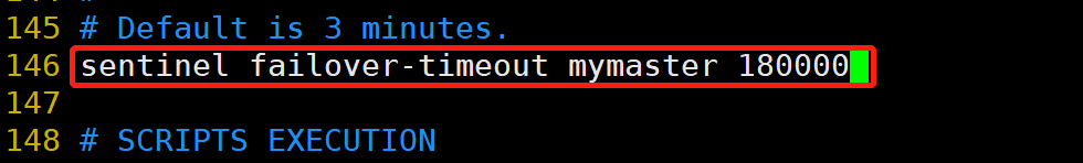 sentinel failover-timeout mymaster 180000 #146行,故障节点的最大超时时间为180000 (180秒 )