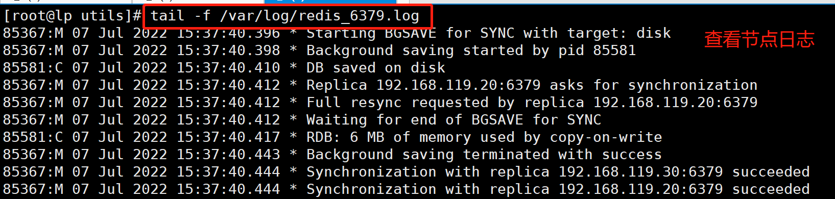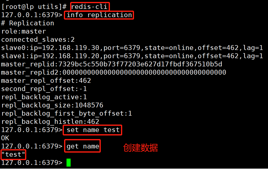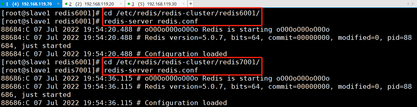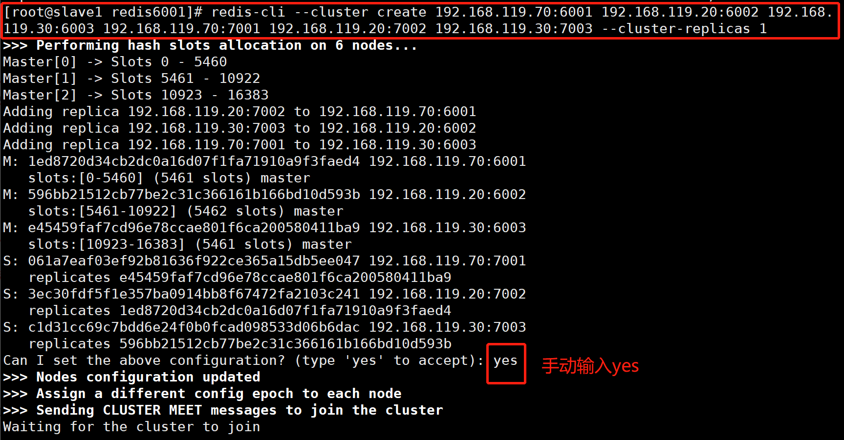 redis-cli --cluster create 192.168.119.70:6001 192.168.119.20:6002 192.168.119.30:6003 192.168.119.70:7001 192.168.119.20:7002 192.168.119.30:7003 --cluster-replicas 1