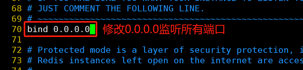 bind 0.0.0.0 #70行,修改bind 项,0.0.0.0监听所有网段