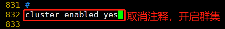 cluster-enabled yes #832行,取消注释,开启群集功能