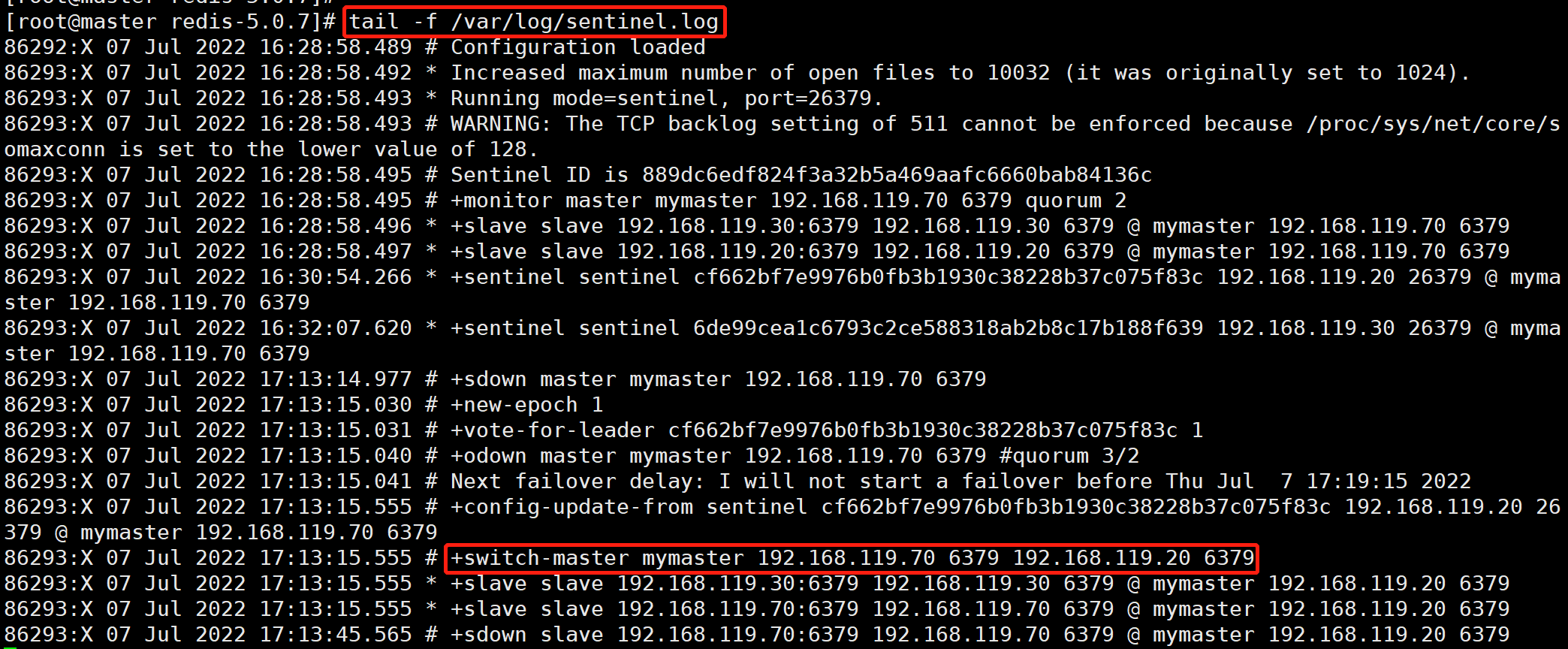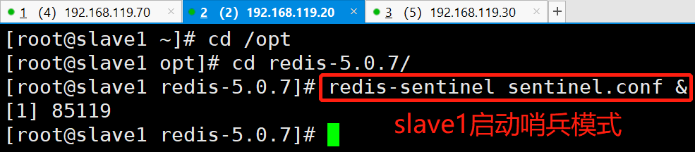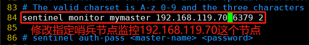 sentinel monitor mymaster 192.168.119.70 6379 2 #84行, 修改