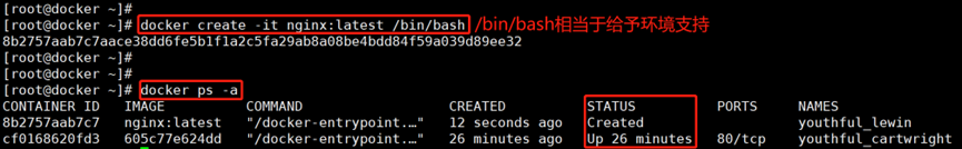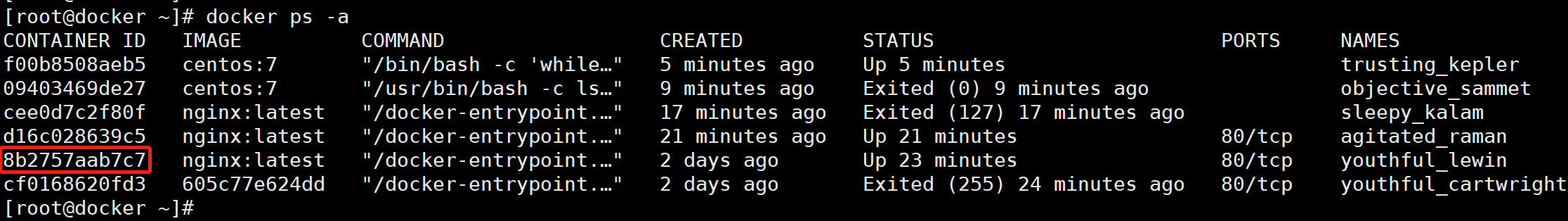 8b0a7be0ff58 nginx:latest "/docker-entrypoint.…" 57 seconds ago Created inspiring_swanson