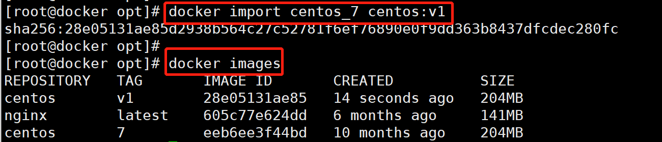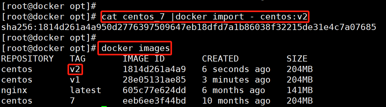 docker import centos_7 centos:v1 #导入后会生成镜像,但不会创建容器