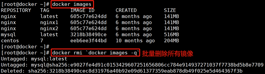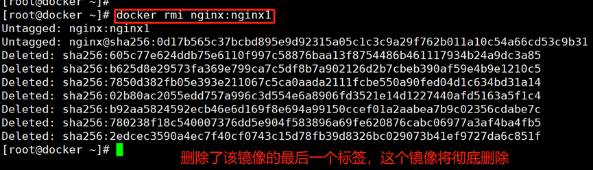 docker rmi 仓库名称:标签 #当一个镜像有多个标签时,只是删除其中指定的标签