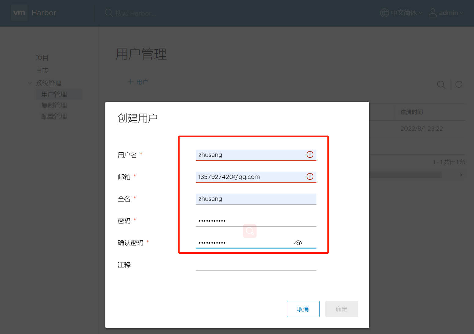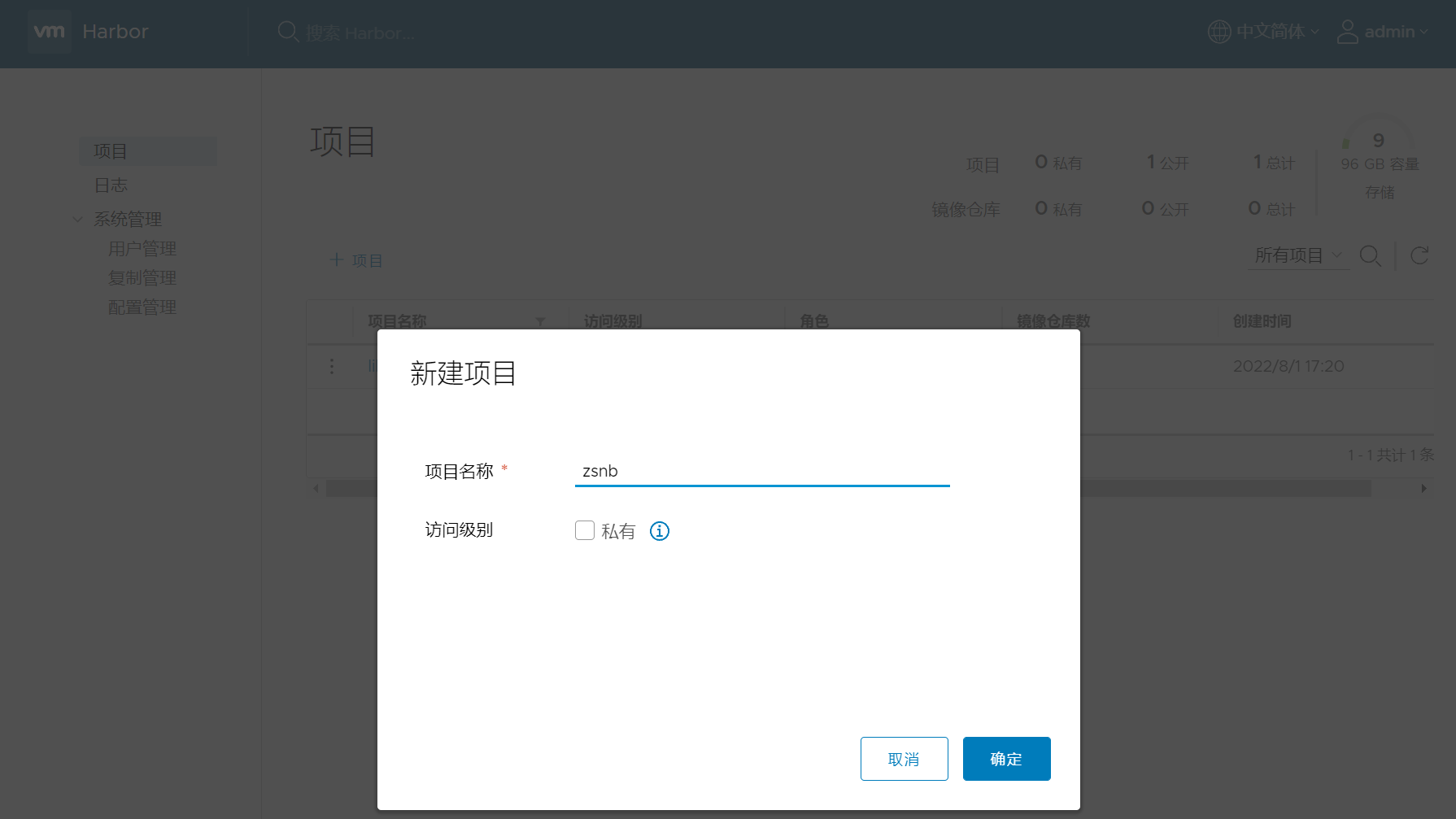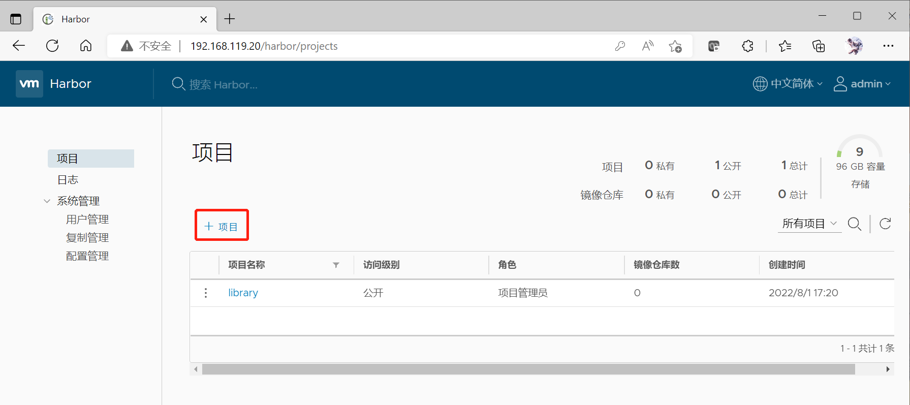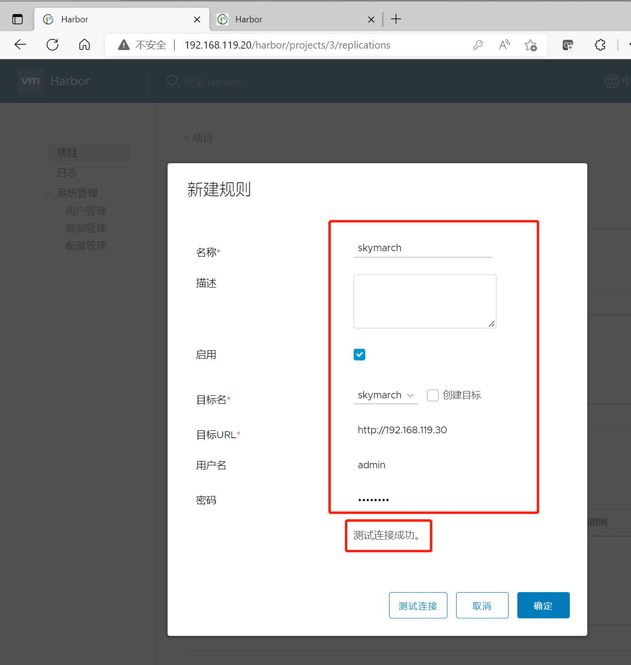 192.168.119.20切换用户admin-> 复制管理 -> +目标 -> 目标名称stevelu -> 目标URL http://192.168.119.30 -> 用户名密码admin/Harbor12345 -> 确定