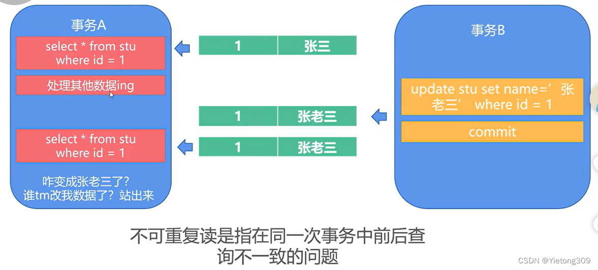 >>>>事务执行力两次相同的查询操作,但是两次操作中间事务B向数据库中增加了一条符合事务A的查询条件的数据, 导致幻读.