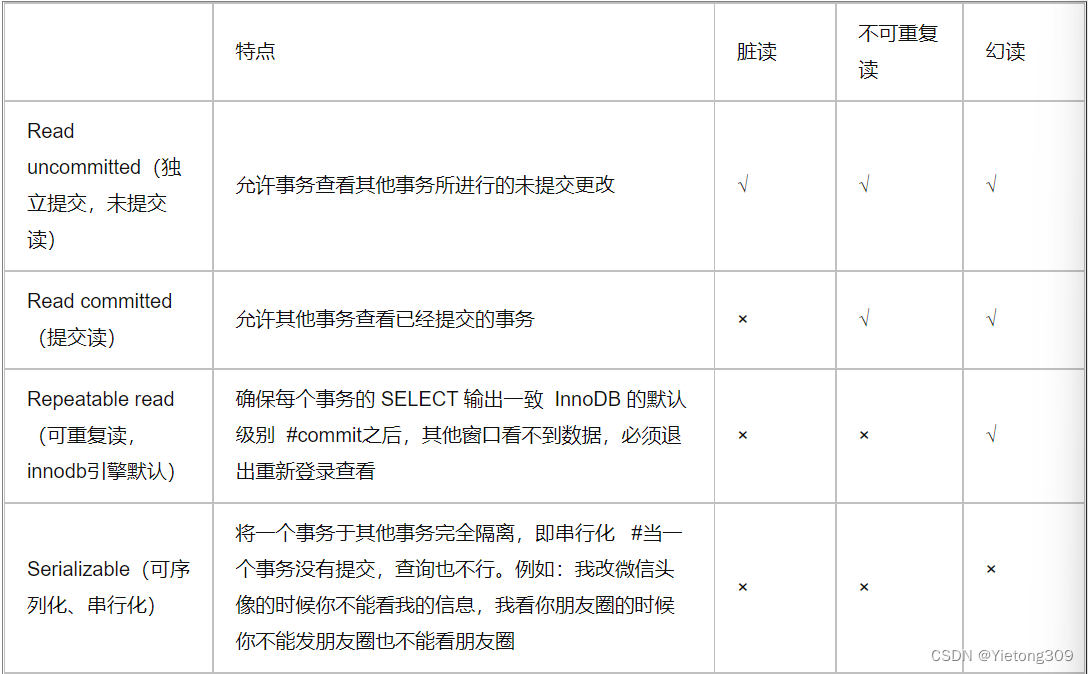 Serializable(可序列化):是最高的隔离级别,前面提到的所有的隔离级别都无法解决的幻读,在可序列化的隔离级别 中可以解决.