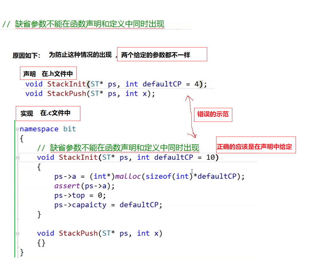注意:如果生命与定义位置同时出现,恰巧两个位置提供的值不同,那编译器就无法确定到底该用那个缺省值