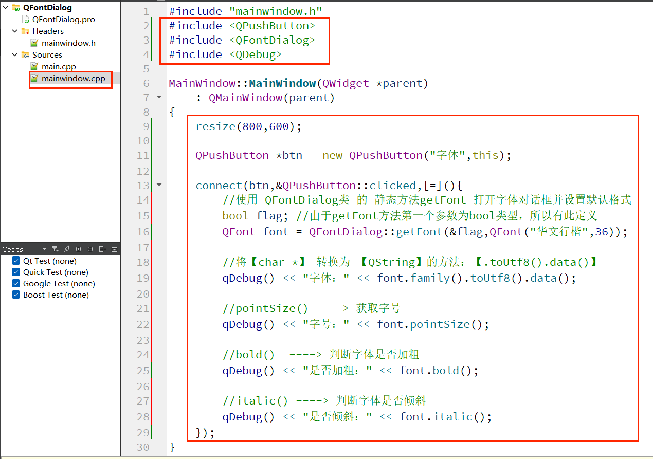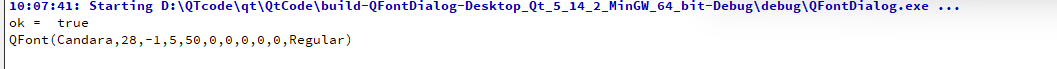 Qt 中提供了预定义的字体对话框类 QFontDialog,⽤于提供选择字体的对话框部件。