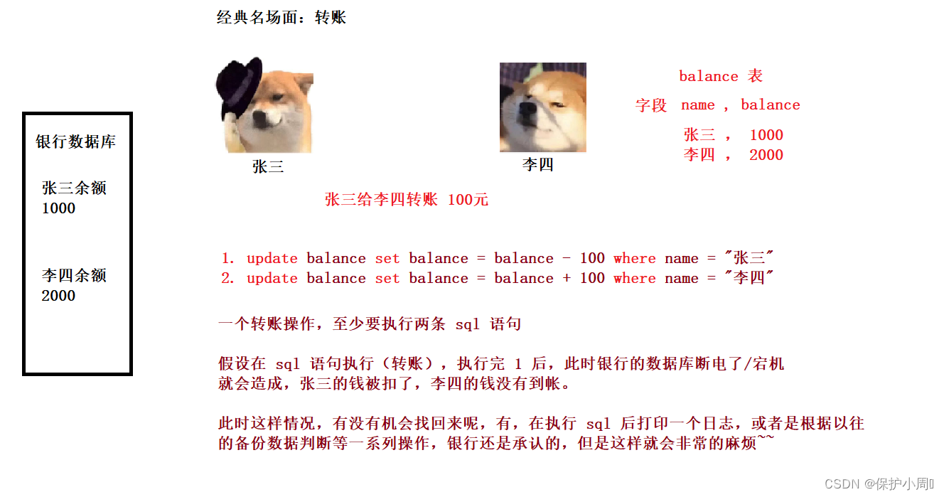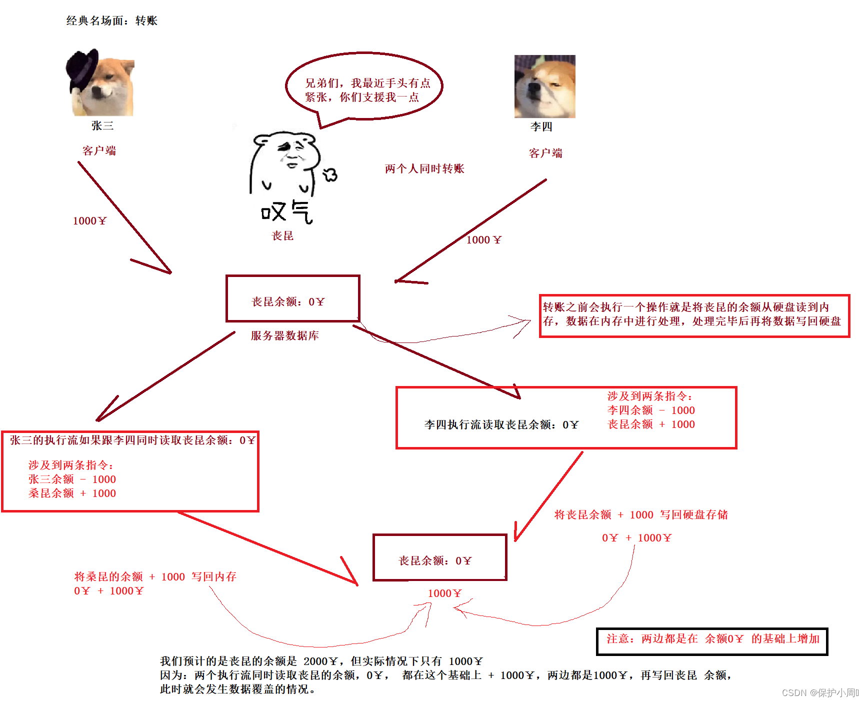 4.隔离性:所谓隔离性就是为了解决,多个执行流,“并发的” 执行事务所引起的问题,这一点就是涉及到多线程安全问题,多个客户端对同一服务器上的 “事务” 调用处理这种情况——转账。